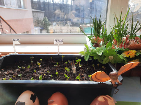 Щороку на підвіконні «Барвінка» малюки традиційно облаштовують городи. Квасоля і кукурудза, помідори і огірки, кріп і редис, цибуля і часничок: діти з нетерпінням чекають, коли з'являються перші паростки городніх рослин, дізнаються про їх будову, вчаться догляду (розпушують ґрунт, поливають). А щоб город став наочним посібником в освітньому процесі, ми вирішили його трішки «оживити»: на барвистих грядках з'явилися фігурки казкових героїв, домашніх тварин, пташок.